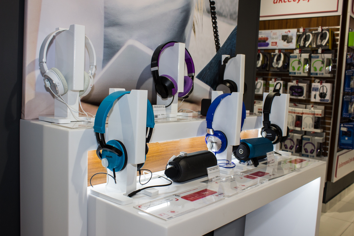 В большей части пространства обновленного магазина акцент сделан на цифровых технологиях, в товарном ассортименте — на инновационных гаджетах. Они встречают покупателей на входе и привлекают внимание на стойках по залу.