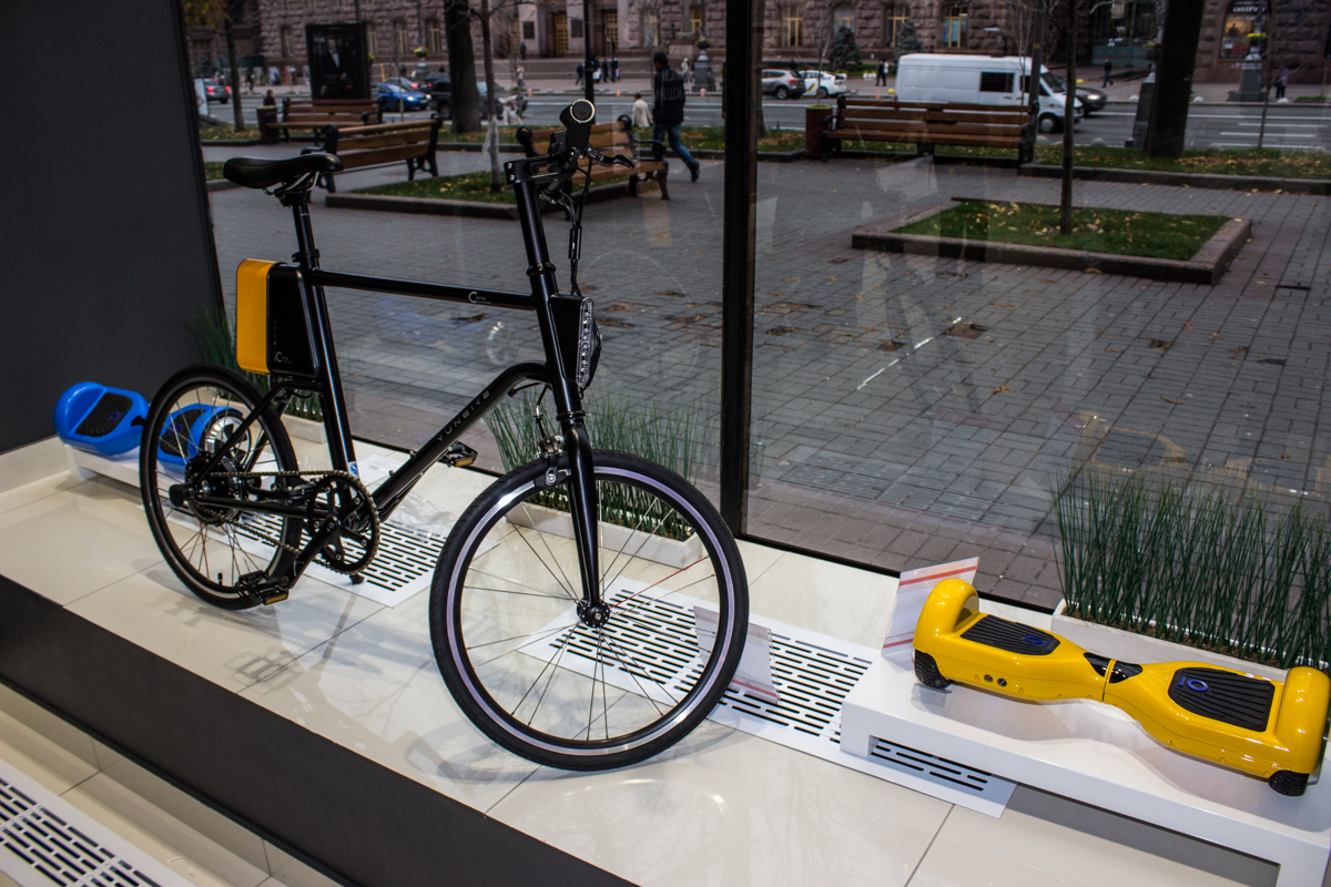 В витринах магазина стоят электровелосипед, гироскутеры, таким образом компания подчеркивает свою продвинутость и инновационность.