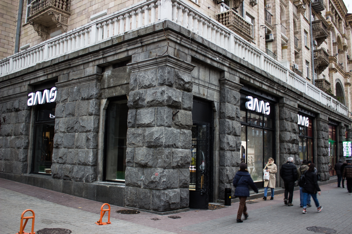 Новый магазин «Алло» открылся на Крещатике в старом здании. Вывески не бросаются в глаза, аккуратно вписаны в оконные проемы. Витрины открытые, привлекающие внимание, без наклеек об акциях или скидках.