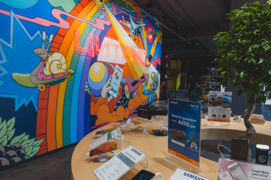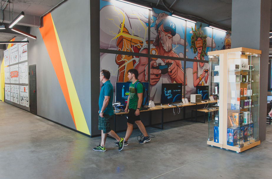 Второй этаж — это зоны развлекательных и обучающих пространств: зона виртуальной реальности, где каждый желающий может попробовать разные модели очков виртуальной реальности и испытать последние технологии игровых приставок и контроллеров. Есть зона релакса, чтобы выпить бесплатную чашечку кофе и поработать в интернете. Зона для детей, в которой можно креативить и без ограничений играть на планшетах.