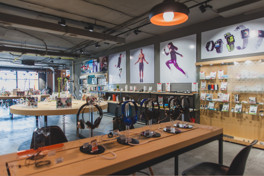 Первый этаж условно разделен на группы гаджетов: есть зоны смартфонов, планшетов, электротранспорта, портативной акустики, зона «умный дом», зона гаджетов для фитнеса и здоровья. Есть не привлекающая излишнего внимания витрина современных интим-гаджетов. И отдельная зона тестирования наушников, где можно спокойно посидеть и «собственными ушами» послушать, какое звучание дает та или иная модель.