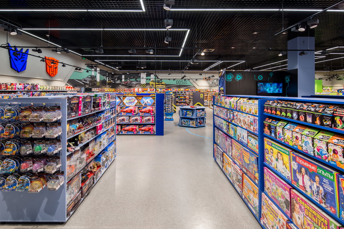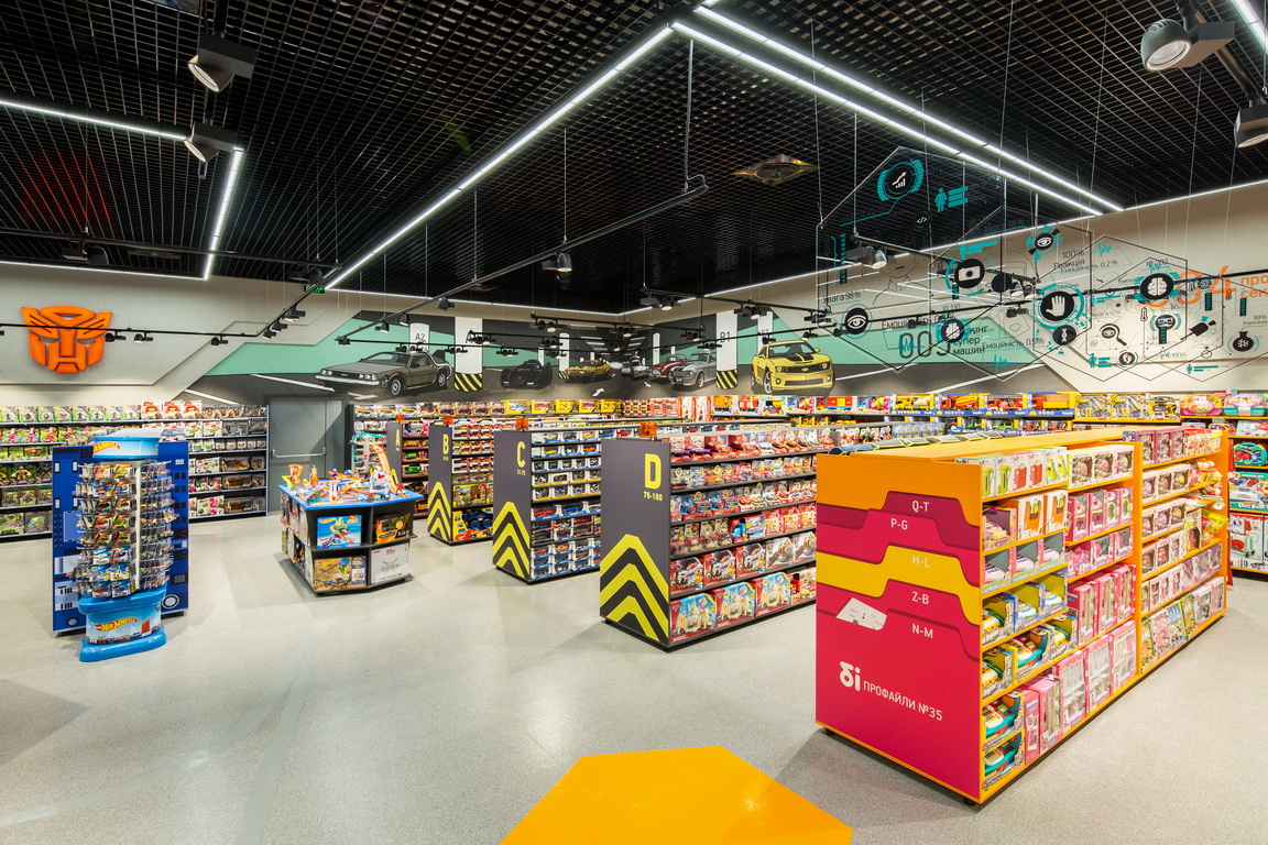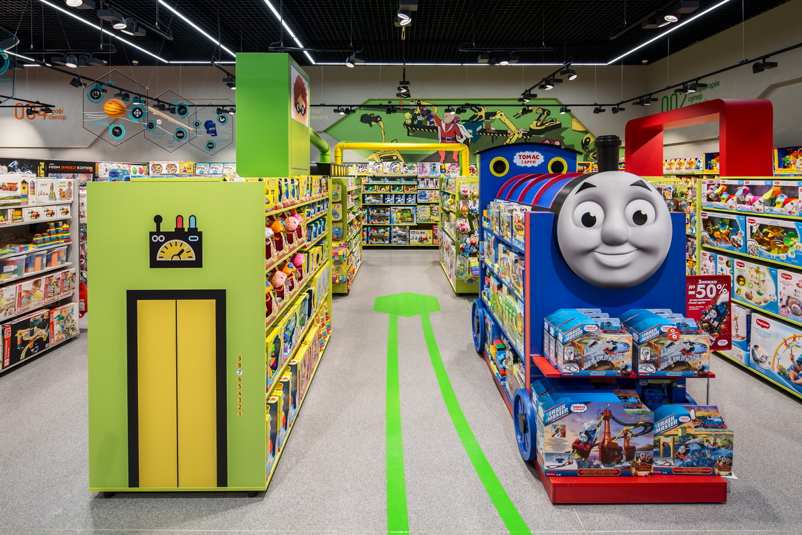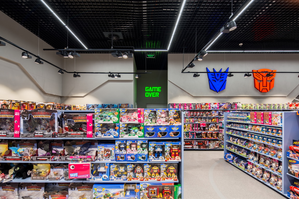 Большая по отношению к среднему формату площадь магазина позволила представить максимально полный ассортимент игрушек для любых предпочтений.