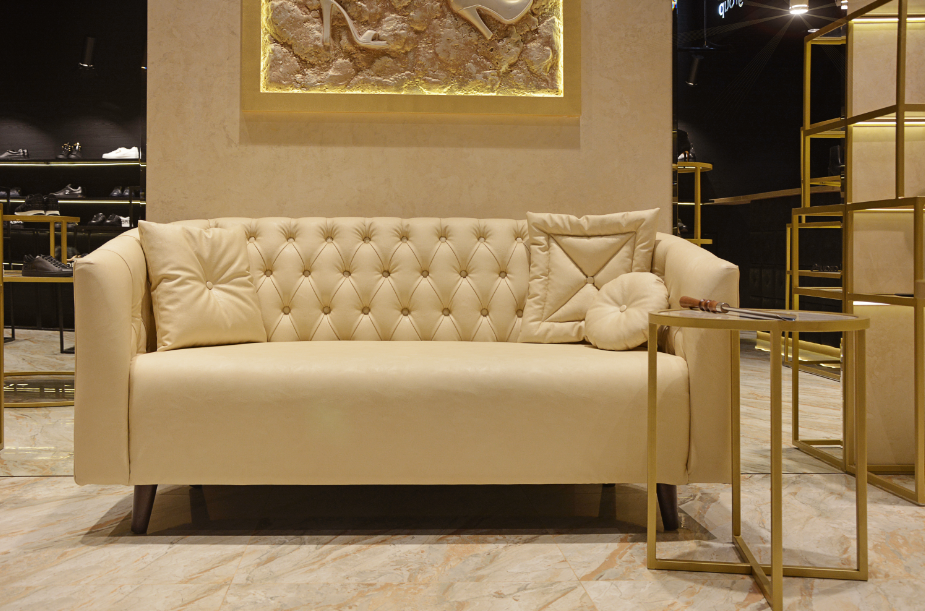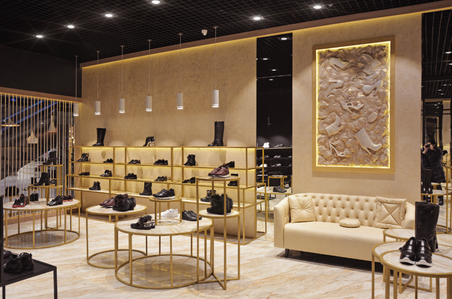 Для оформления интерьера магазина, который будет продавать обувь и аксессуары только люкс-класса, использовались такие материалы, как мрамор, дерево, кожа, металл, стекло и зеркала.