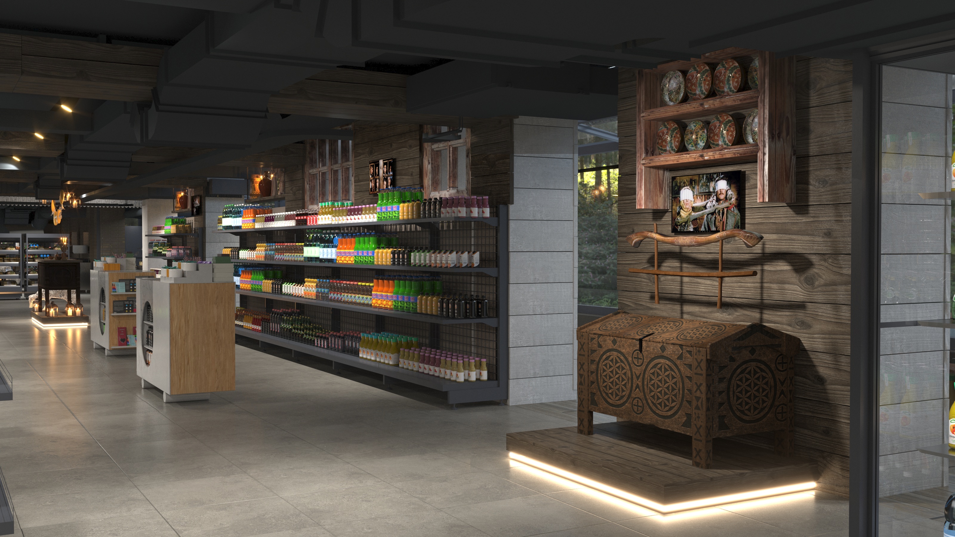 Супермаркет поділений на десять виставкових тематичних зон, які ніби ведуть гостей крізь основні сюжетні повороти фільму "Тіні забутих предків". У кожній зоні оживають переосмислені образи зі стрічки, як-от ярмо зі сцени вінчанння — символ шлюбу за домовленістю, чи вогняні коні — алюзія на культову сцену смертельного поранення Петра Палійчука. Біля Гастрономії здіймаються трембіти — нагадування про музичний внесок народних музик і композитора Мирослава Скорика. Поруч — справжні артефакти оспіваної гуцульської культури: автентичний посуд, свічники-трійці, предмети побуту й меблі. Їх команда "Сільпо" знайшла під час експедицій до Коломиї та Косова. А над усім — знакові фрази з фільму, що світяться червоним неоном, мов багряні титри стрічки.