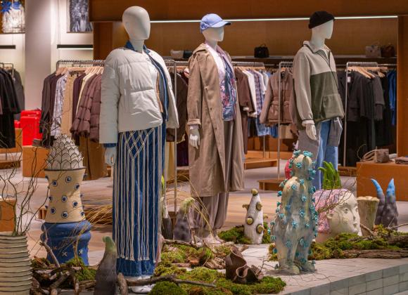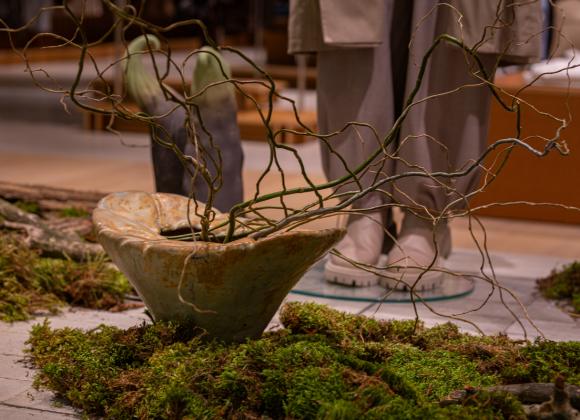 Вхідну групу у новому магазині перетворили на арт-інсталяцію “Зачарований ліс” у колаборації з українськими митцями та майстрами. Тут представлені керамічні арт-обʼєкти від бренду Maslo Ceramics, майстри якого у своїй творчості переосмислюють взаємозвʼязок природи та людини та кераміка ручної роботи від Darya Pedorenko Ceramics. Декоровано інсталяцію мохом, гілками та корою дерев з лісів Київщини.