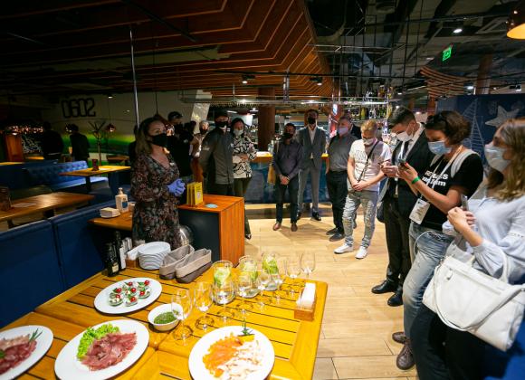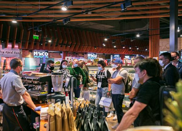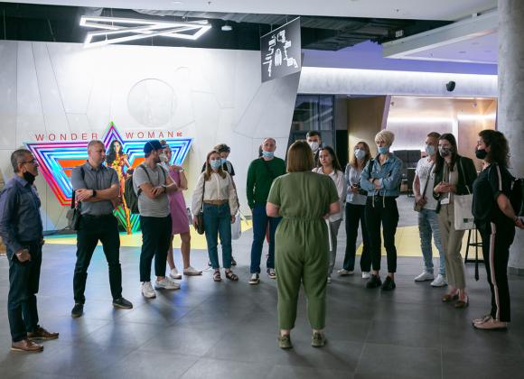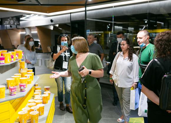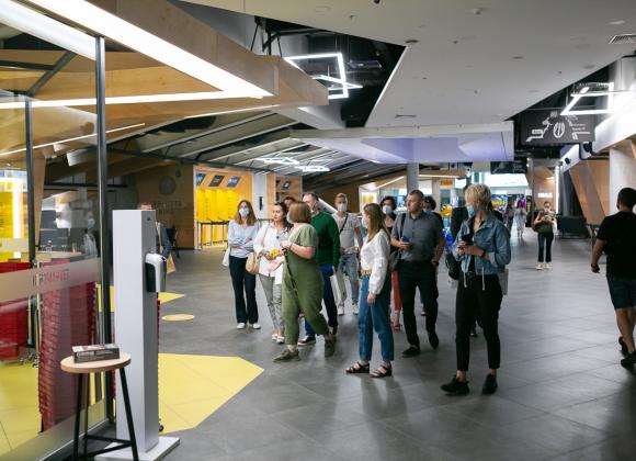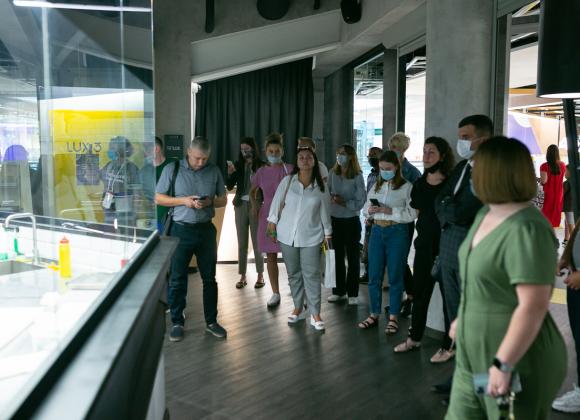 Первой точкой экскурсии стала "Планета кино". 70% клиентов этой сети покупают билеты в онлайне, оставшиеся – приходят за билетами на кассу при кинотеатре. Компания работает над улучшением клиентского опыта – это проявляется и в размере кресел и проходов между ними, до быстрой обратной связи с помощью мобильного приложения. В "Планета кино" работает "Киномаркет", который представляет собой супермаркет снеков и напитков. Типичная боль посетителя кинотеатра, когда он опаздывает на свой сеанс, но вынужден стоять в очереди за поп-корном. Супермаркет как раз решает эту боль. На территории "Планета кино" работает ресторан с открытой кухней, бар, а также ресурсная комната, предназначенная для людей с аутизмом или просто тех, кто устал. В ней можно уединиться в тишине.