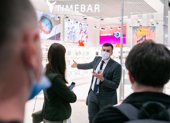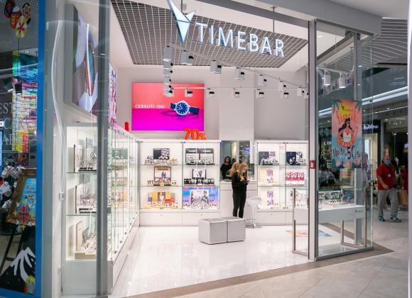 TimeBar — ритейлер наручных дизайнерских часов и аксессуаров, который насчитывает 9 розничных точек в торговых центрах Киева, Харькова, Днепра и Херсона и развивает свой интернет-магазин. Угловой магазин хорошо виден и с эскалаторов и из торговых галерей. За счет правильных световых решений он привлекает трафик из торговой галереи. В частности, как рассказал основатель компании "Нова лайт" Владимир Кличановский освещенность витрины, в десять раз сильнее, чем освещение в проходе, но при этом гостям комфортно находится в зале. Магазин TimeBar в этом ТРЦ показывает лучшие показатели продаж по сравнению с точками в других ТРЦ.