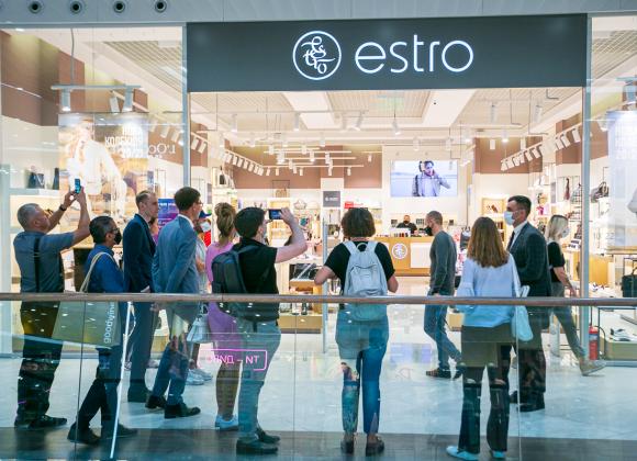 EstroShoes — ритейлер обуви, которая насчитывает 18 магазинов в торговых центрах Украины. Поскольку обувь ассоциируется с теплотой, концепция магазина River Mall построена вокруг теплоты и комфорта. Этому способствуют теплые оттенки белого в интерьере и правильные световые решения. В магазине работает собственный арома-маркетинг и музыкальное сопровождение, настраивающее гостей на нужное эмоциональное состояние для шоппинга.