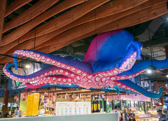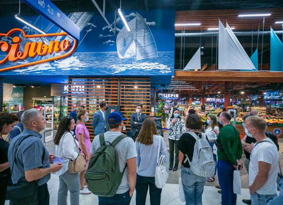 "Сільпо" в ТРЦ River Mall открылся в 2019 году в тематике яхт-клуба. Концепция была продиктована расположением — рядом с ТРЦ находится порт. Как рассказала директор по маркетингу “Сільпо” Екатерина Огуряева, ритейлер не старается конкурировать в ценовом поле, а работает с сервисом и впечатлениями. Каждый новый магазин наполняют собственными “фишками” и возможностями для создания впечатления. Гости store tour посетили отдел гастрономии с собственной сыроварней, пекарню с дровяной печью, кофейню. Помимо кулинарии, на территории супермаркета работает ресторан и дегустационная зона для сомелье. Ритейлер поддерживает локальных производителей. Их товары представлены в специализированных корнерах "Лавка традицій". Сеть также проводит обучающие бизнес-курсы для феремеров "Фудпросвіта". Для своих гостей компания проводит гастротуры одного дня на фермерские хозяйства, которые называются "Агромандри". Все это способствует созданию эмоциональной связи между брендом ритейлера и его покупателями.