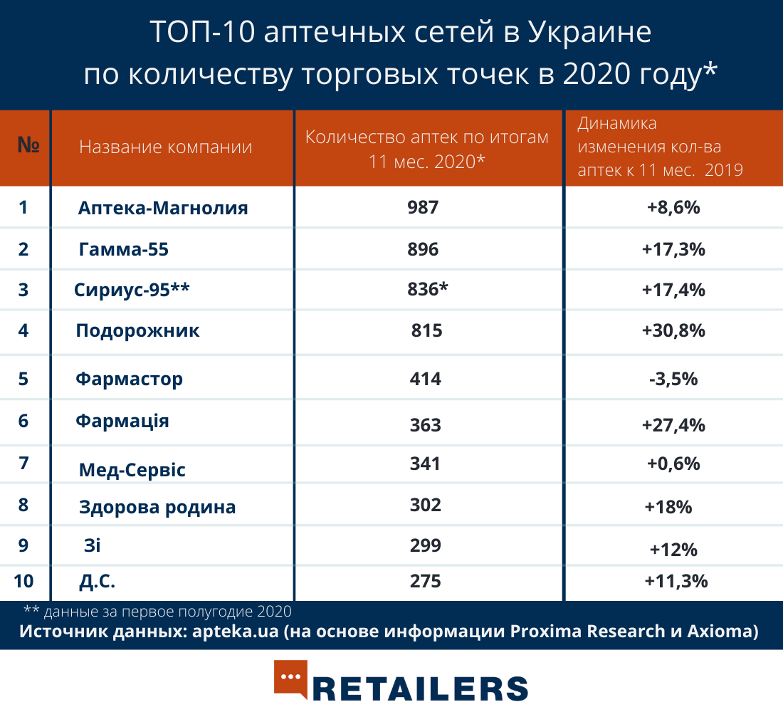 Крупнейшие аптечные сети Украины по итогам 2020 года