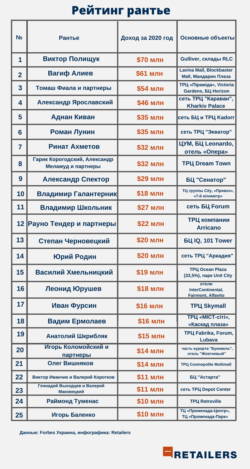 Forbes.ua выпустил рейтинг крупнейших рантье Украины. Суммарный арендный доход топ-25 крупнейших арендодателей Украины составил $665 млн, 60% из этого приходится на торговую недвижимость. Кто входит в этот рейтинг?