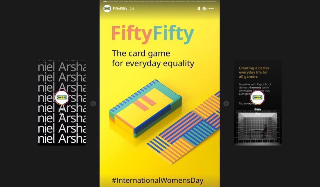 В этом году в связи с Международым женским днем IKEA выпустила бесплатную digital игру в Instagram Stories под названием FiftyFifty. Она должна показать проблему неравенства распределения домашних обязанностей во всем мире. Игра разработана в сотрудничестве с эксперткой по отношениям Дженни Миллер.