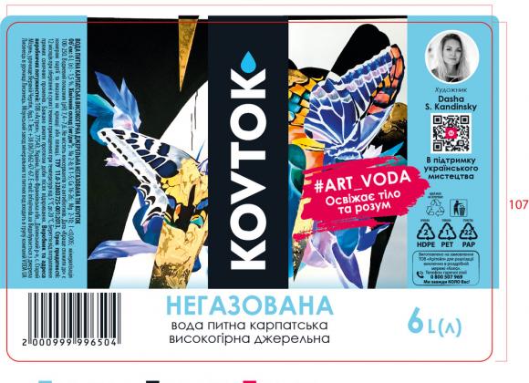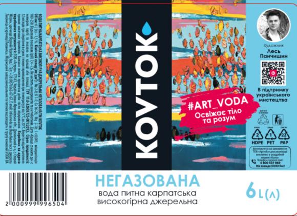 Вода Kovtok серии #art_voda также представлена в оригинальной упаковке. На этикетках напечатаны репродукции картин современных художников родом из Украины: Леся Панчишина, Дашы Скорубской-Кандинской, Андрея Аксютова и Александра Онищенко.