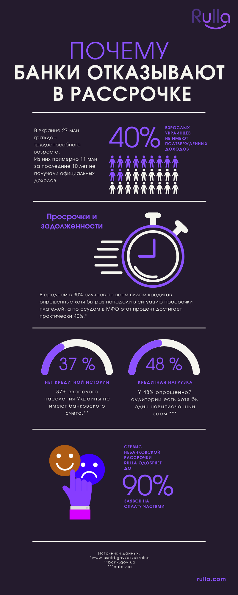 Сервис небанковской рассрочки от Rulla позволяет одобрять максимальное количество заявок, так как применяет принципиально иные методы оценки платежеспособности клиентов. Оплата частями от Rulla доступна держателю любой банковской карты в Украине. Оформление беспроцентной рассрочки при покупке у магазина-партнера Rulla происходит буквально в несколько кликов, не требует заполнения форм и предоставления дополнительной информации.