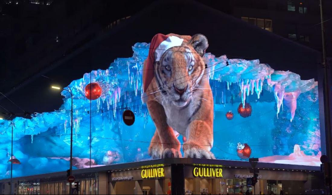 На фасаде ТРЦ Gulliver установили 3D-инсталляцию тигра. Он бросает в зрителей новогодние игрушки