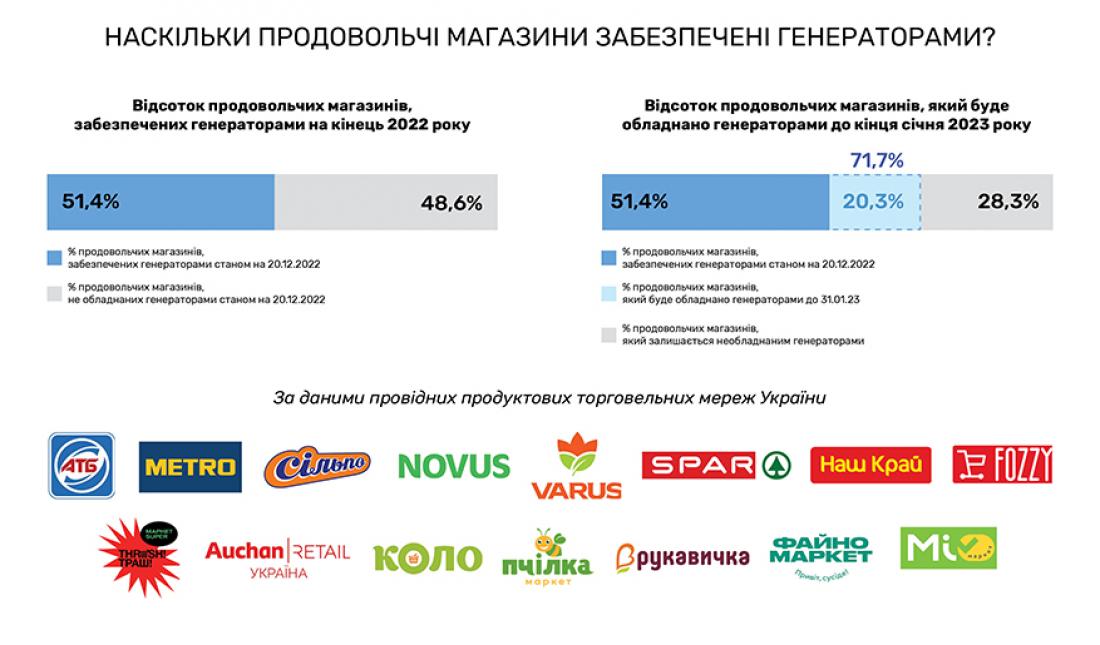 Станом на кінець 2022 року генераторами забезпечено 51,4% магазинів найбільших продовольчих мереж України. Про це свідчать дані опитування, проведеного Асоціацією рітейлерів України серед 15 українських торговельних мереж — членів Асоціації.