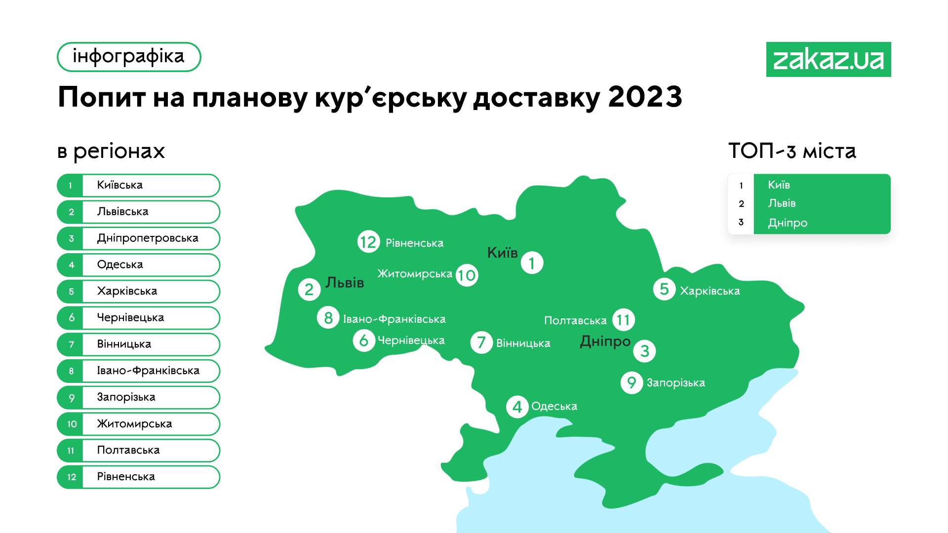 Найбільшу популярність послуга кур’єрської доставки має у мегаполісах та містах мільйонниках, де проживає велика кількість населення та, відповідно, є великий попит. Особливо це стосується Київського регіону, на який припадає частка у 62% серед замовлень на планову доставку. Зокрема, це обумовлено тим, що саме у столиці знаходиться значна кількість магазинів партнерів-ритейлерів. Наразі найбільша кількість замовлень серед користувачів Zakaz.ua спостерігається у Київській, Львівський та Дніпропетровській областях, що входять у трійку лідерів.