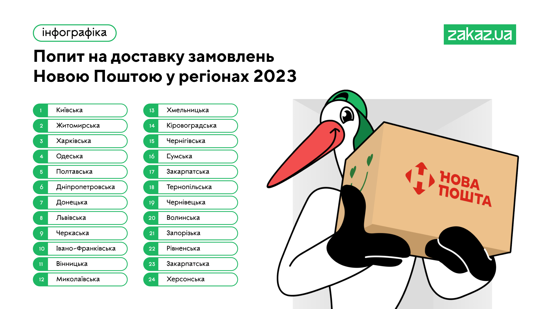 В Україні найбільший попит на доставку замовлень Новою Поштою спостерігається серед мешканців наступних областей: Київська (частка 27,87%), Житомирська (11,12%), Харківська (10,29%), Одеська (8,14%) та Полтавська (5,96%). Найменше було доставлено замовлень Новою Поштою користувачам Zakaz.ua у Херсонську, Закарпатську та Рівненську області, де частка не сягає й 1%.