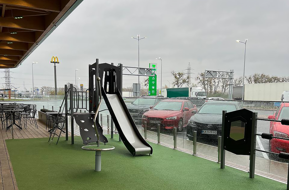 В зоні тераси спорудили дитячий майданчик з батутом, каруселлю, інтерактивними панелями, переговорним пристроєм, ігровим комплексом з гіркою.