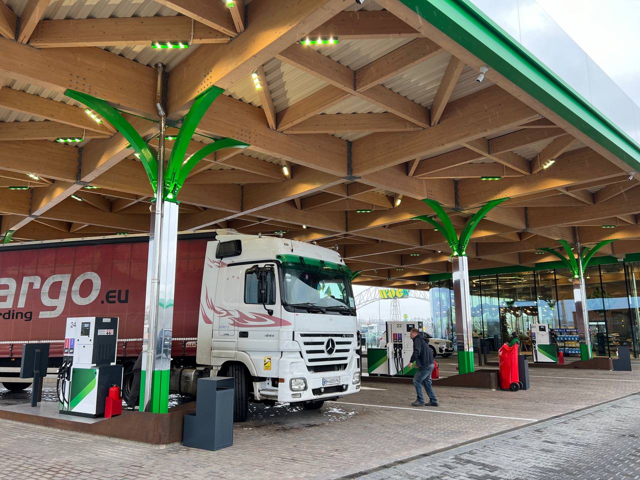 На АЗК реалізовано розділення потоків на легковий транспорт та великогабаритний (фури та автобуси). Загалом одночасно можуть заправлятися 24 авто із двигунами внутрішнього згоряння.