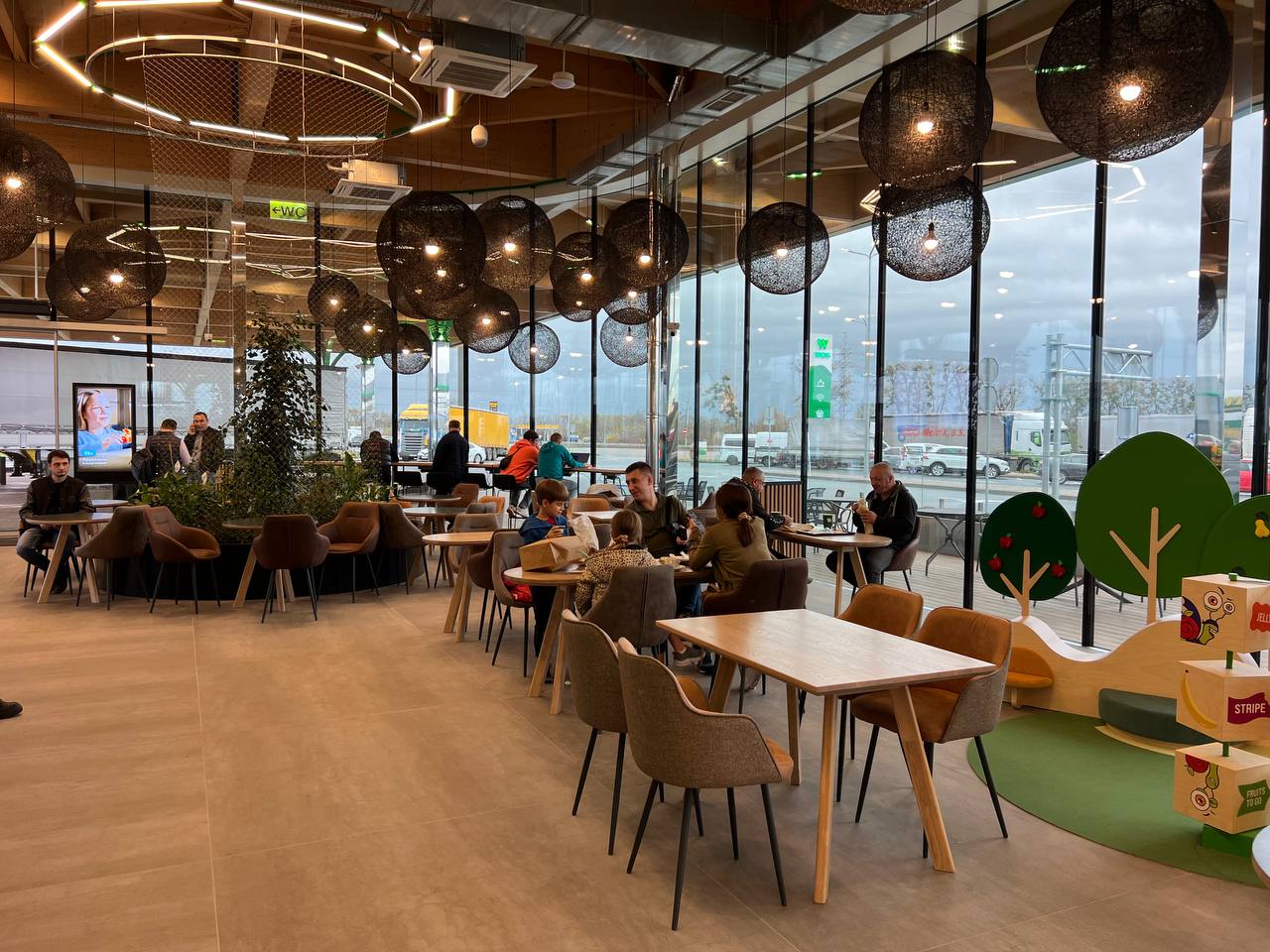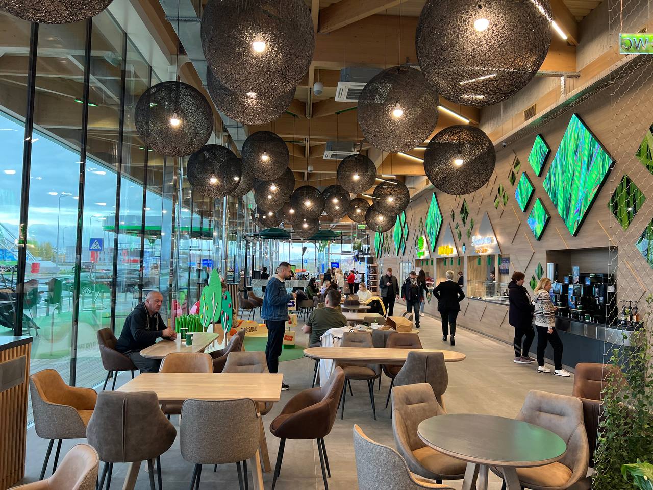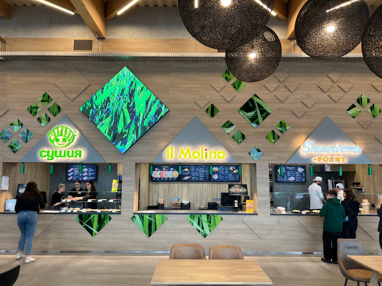 Два фудхоли на майже 100 посадкових місць виконують одночасно низку функцій: тут можна як швидко перекусити, так і з комфортом поснідати, пообідати чи повечеряти, а також зарядити гаджети (в залі розташовані дротові та бездротові зарядки), попрацювати чи відповісти на терміновий мейл під час зупинки.