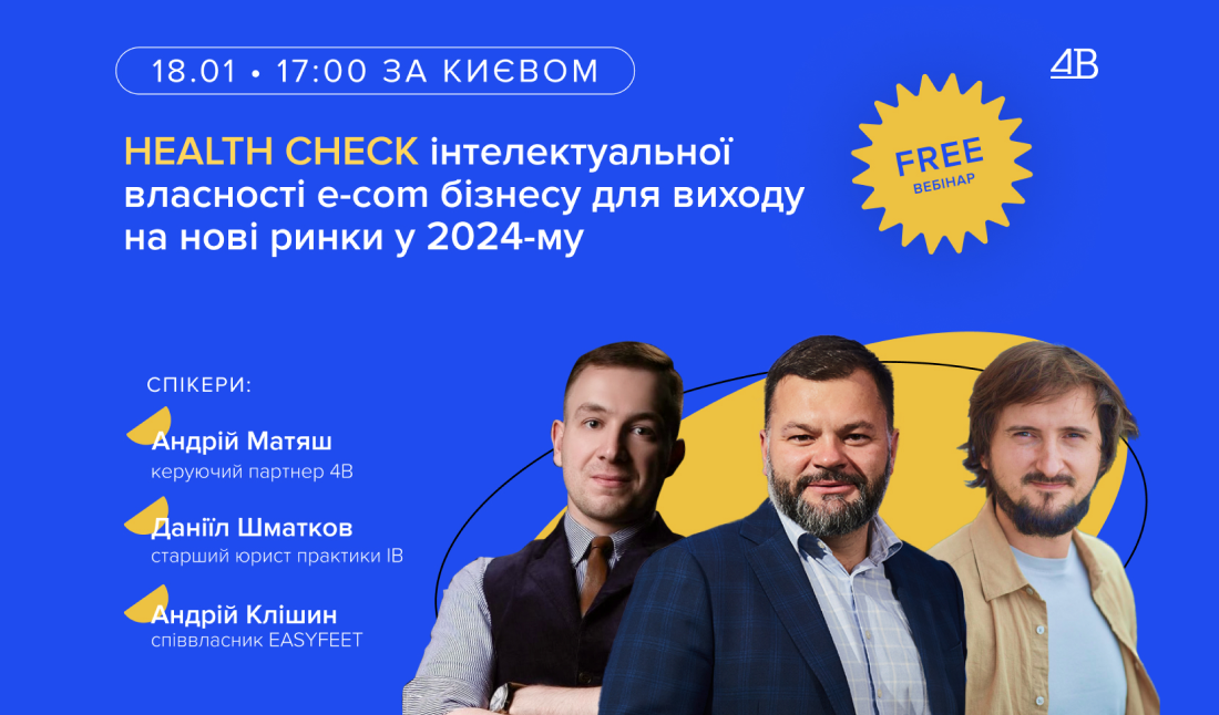 Як не дати конкуренту отримати інтелектуальну власність раніше при виході на нові ринки? Саме про це поговоримо 18 січня на безоплатному вебінарі від команди юридичної компанії 4B – “Health Check інтелектуальної власності e-com бізнесу для виходу на нові ринки у 2024-му”