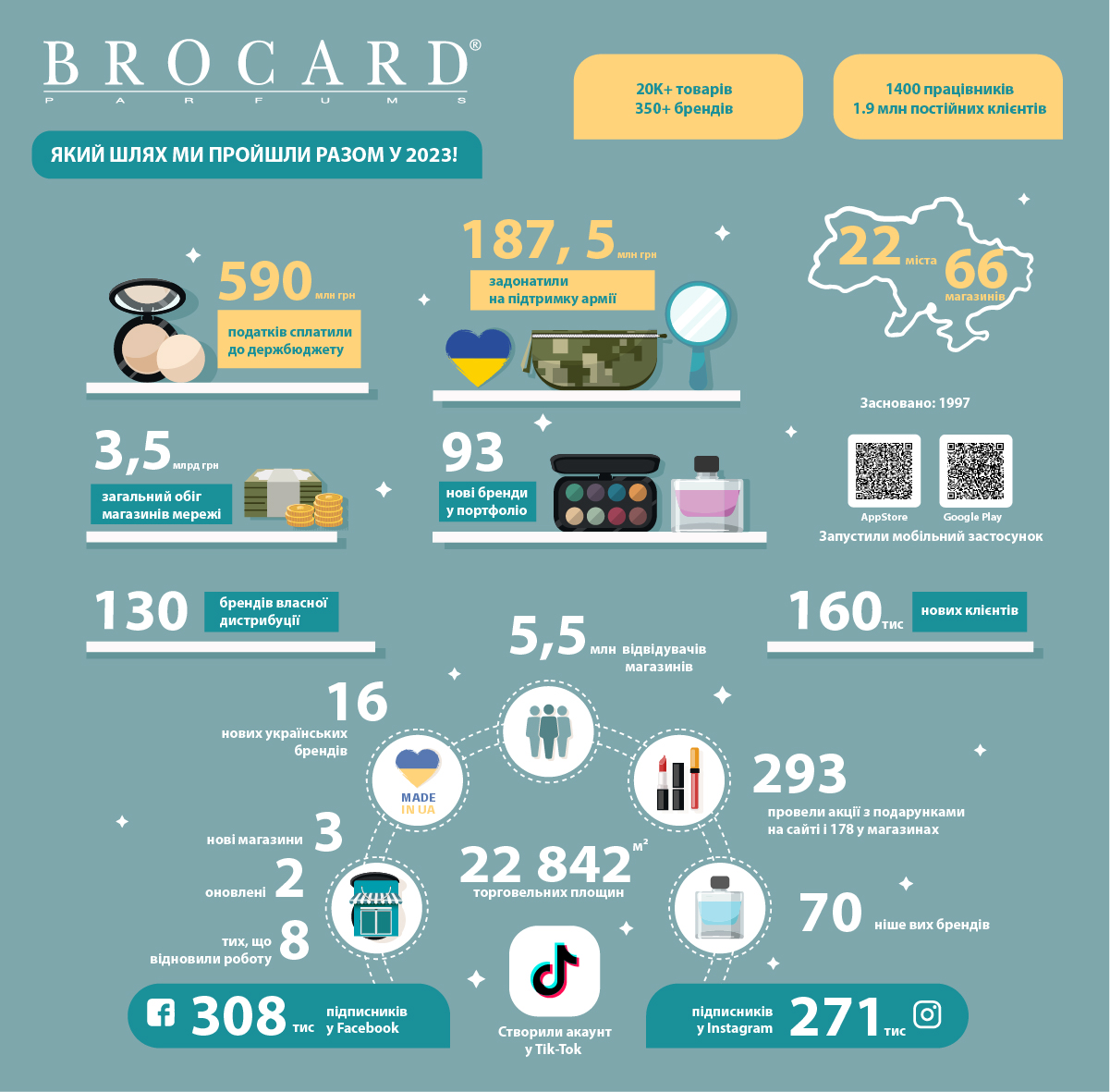 У 2022 році у 26 містах України працювало біля 100 магазинів BROCARD. 30 з них було закрито після повномасштабного вторгнення рф та окупації частини території країни. У 2023 році група свідомо почала відновлення мережі: три нових магазини відкрилися у Луцьку, Івано-Франківську та Вінниці, ще два магазини розпочали роботу в оновленому сучасному форматі. Наразі мережа налічує 66 магазинів у 22 українських містах, які відвідали понад 5,5 мільйонів клієнтів. Більше 160 тисяч нових відвідувачів зареєструвалися у магазинах мережі та на сайті brocard.ua, відкритому у 2020 році. У грудні 2023 року був запущений мобільний застосунок BROCARD. На сьогодні кількість клієнтів перевищує 1,9 мільйонів.