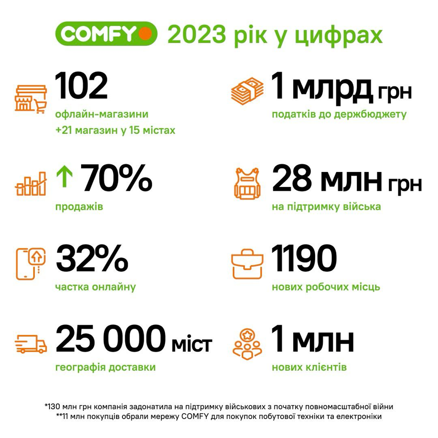 Підсумки COMFY в 2023 році: +24 магазини, 1190 нових робочих місць, понад 1 мільярд гривень податків