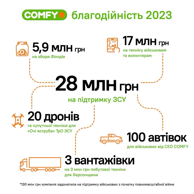 З 2014 року одним з пріоритетних напрямів благодійності та соціальної відповідальності COMFY є допомога українським захисникам та волонтерам. З початком повномасштабної війни у лютому 2022 року компанія лише посилила цей напрям.