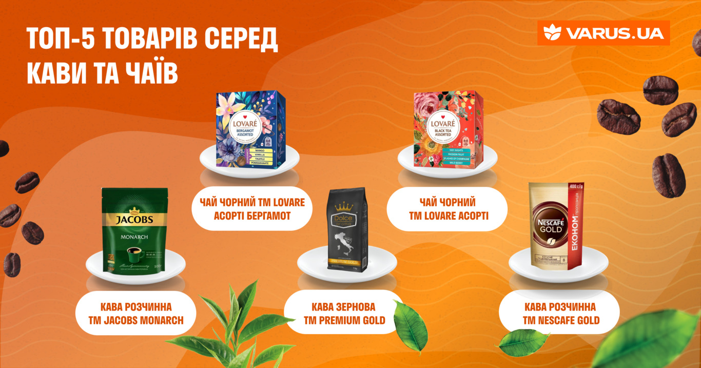 Зима — це також період особливої популярності традиційних зігріваючих напоїв. Із широкого асортименту кави та чаїв на VARUS.UA клієнтиі найчастіше обирали: Кава розчинна ТМ Nescafe Gold та ТМ JACOBS Monarch; Чай чорний та зелений асорті від ТМ Lovare; Кава зернова ТМ Premium Gold Dolce Aroma.