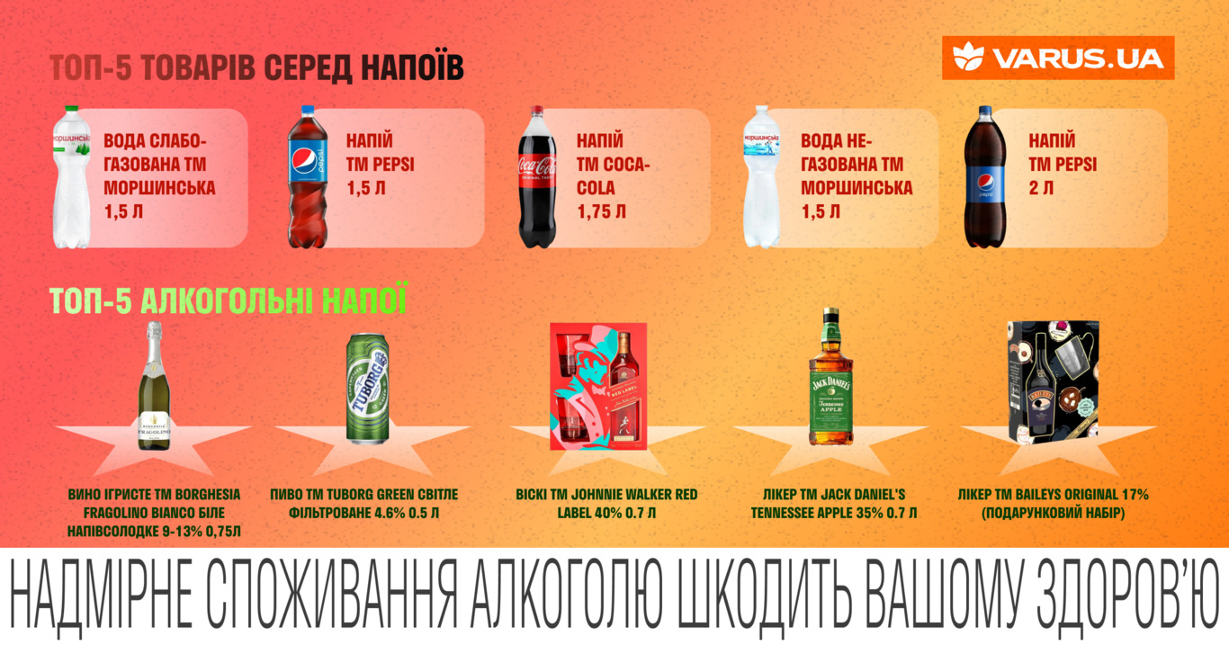 Оскільки зима — період свят, українці також часто додавали до свого кошика алкогольні напої. Смаки клієнтів виявились різноманітними — у ТОП-5 потрапили як слабоалкогольні, так і більш міцні напої. Так, до найбільш популярних алкогольних напоїв на VARUS.UA увійшли: Лікер Jack Daniel's Tennessee Apple 35%; Вино ігристе Borghesia Fragolino Bianco біле напівсолодке 9-13%; Лікер Baileys Original 17% (подарунковий набір); Пиво Tuborg Green світле фільтроване 4.6%; Віскі Johnnie Walker Red Label 40%.