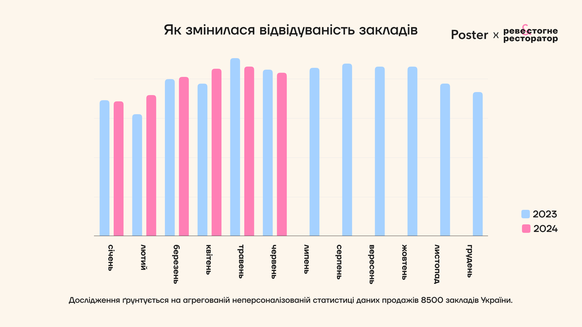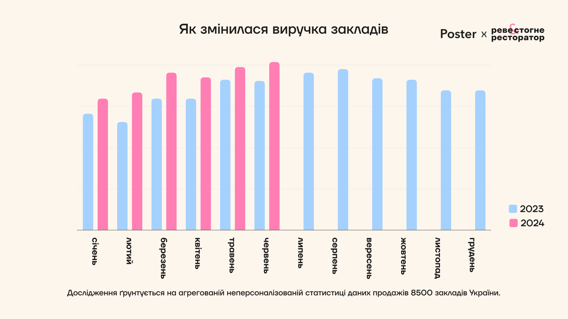 Виручка закладів громадського харчування за півроку показала зростання на 16% у порівнянні із тогорічним показником. У лютому-квітні відвідуваність закладів харчування зростала, поки не обвалилася у травні-червні. Однак загальна цифра півріччя виявилась позитивною: +2% у I півріччі 2024, ніж у такому ж періоді 2023 року.