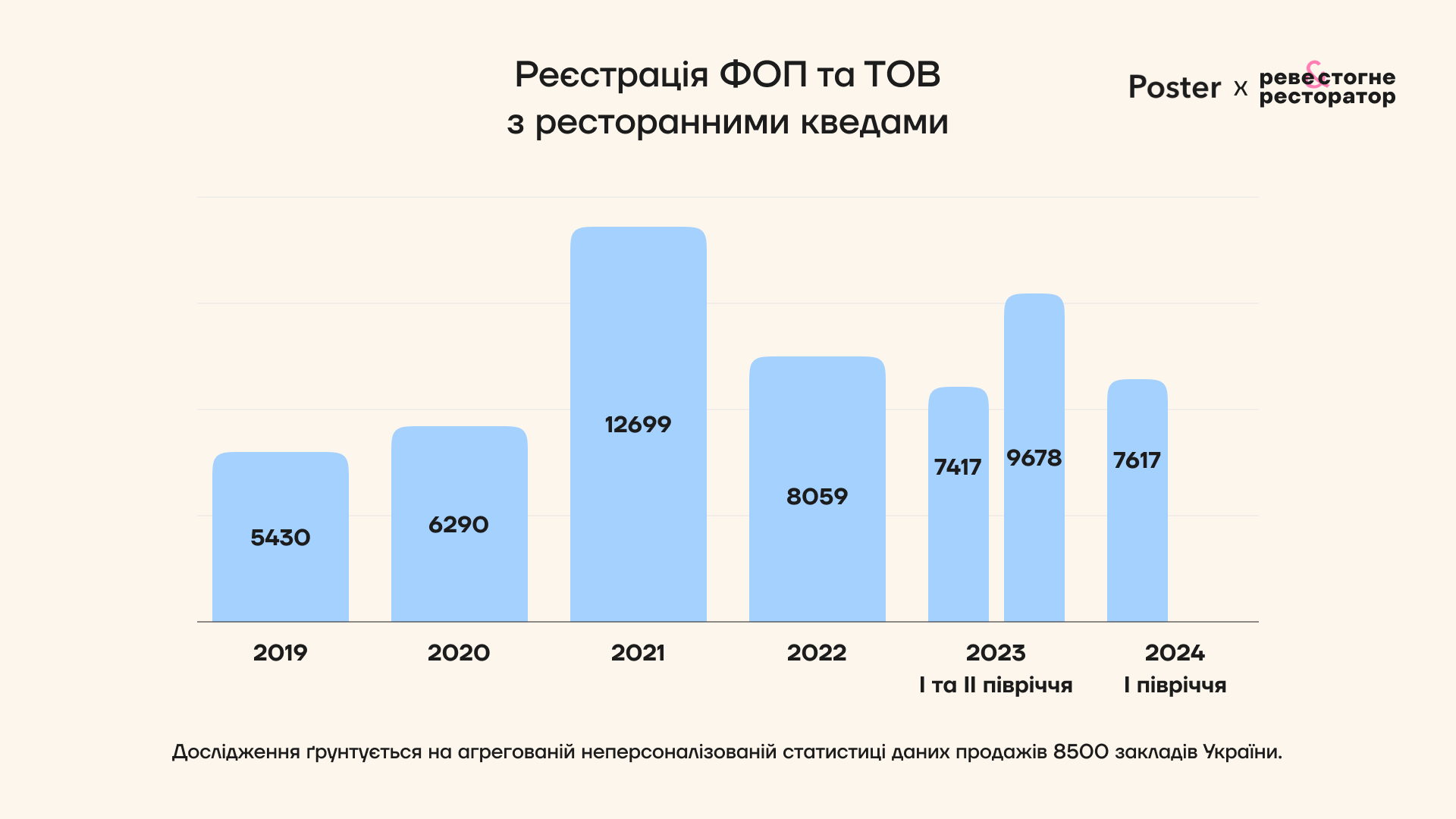 Проте складні обставини, в яких вимушені працювати заклади зараз, не зупиняють ринок. У I півріччі 2024 року за ресторанними КВЕДами вже зареєструвалося 7617 ФОП та ТОВ, що на 3% більше, ніж за такий же період торік.