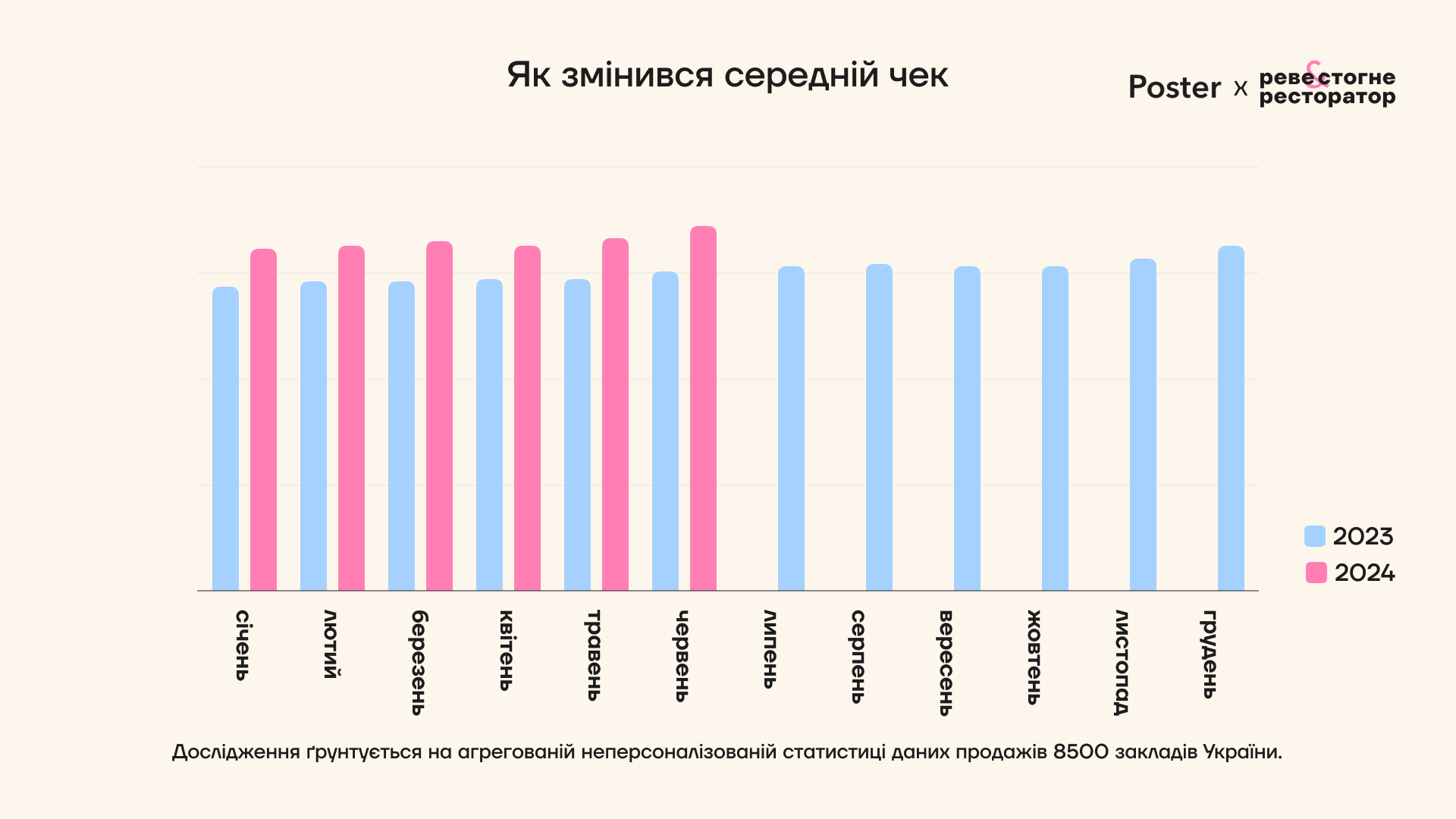 Середній чек закладів громадського харчування зріс на 13% до 148 грн в I півріччі 2024 року у порівнянні з I півріччям 2023 року внаслідок підняття цін. Про в дослідженні української компанії з автоматизації закладів Poster