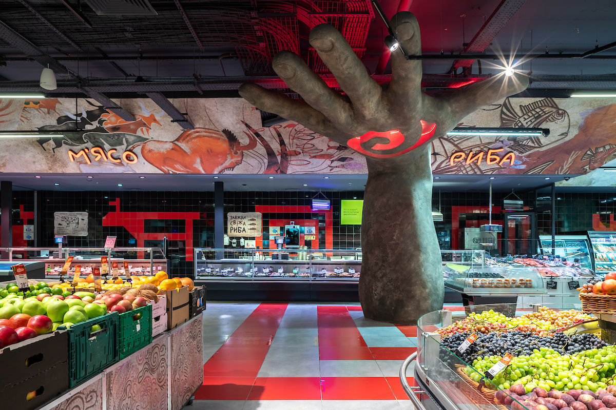 Наскельні малюнки в магазині натякнуть на те, що вполювати у відділі випічки, допоможуть з вибором рибки власного посолу та копчення, піци власного виробництва і приготованих страв у відділі кулінарії.