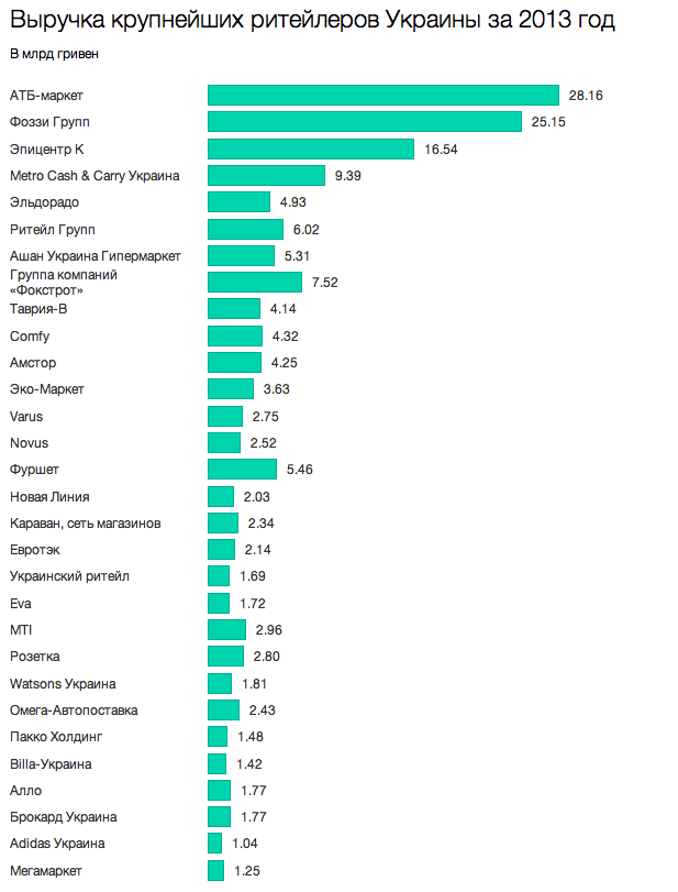 Лидером среди ритейлеров в 2014 году остается «АТБ-маркет», выручка которого составила 39 млрд грн, на втором месте Fozzy Group с выручкой 36,1 млрд грн, а третий среди ритейлеров, как и в прошлом году, «Эпицентр К» с выручкой 22,12 млрд грн. Крупнейшие игроки нарастили оборот в гривнах, что, с одной стороны, вызвано девальвацией и связанным ростом цен, с другой говорит о продолжающемся развитии форматов организованной торговли.