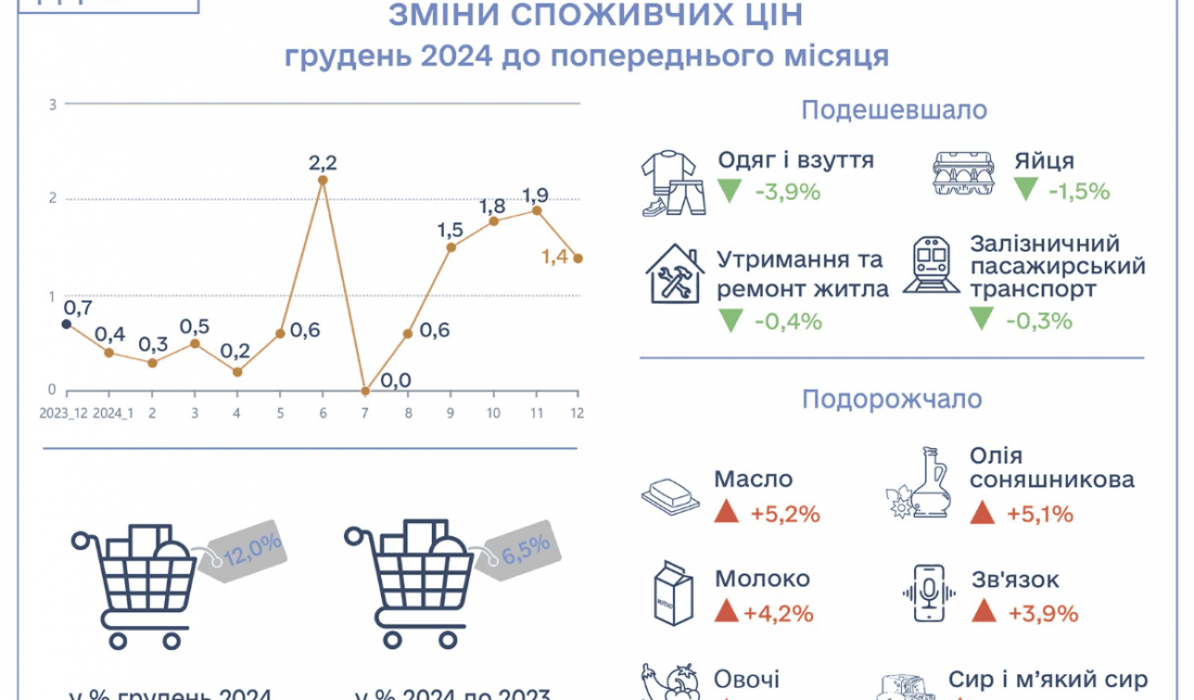 На споживчому ринку у грудні ціни на харчові продукти та безалкогольні напої зросли на 1,8%. На 5,2–1% подорожчали вершкове масло, олія соняшникова, молоко й молочні продукти, овочі, продукти перероблення зернових, хліб, яловичина, риба та продукти з риби, макаронні вироби, свинина.