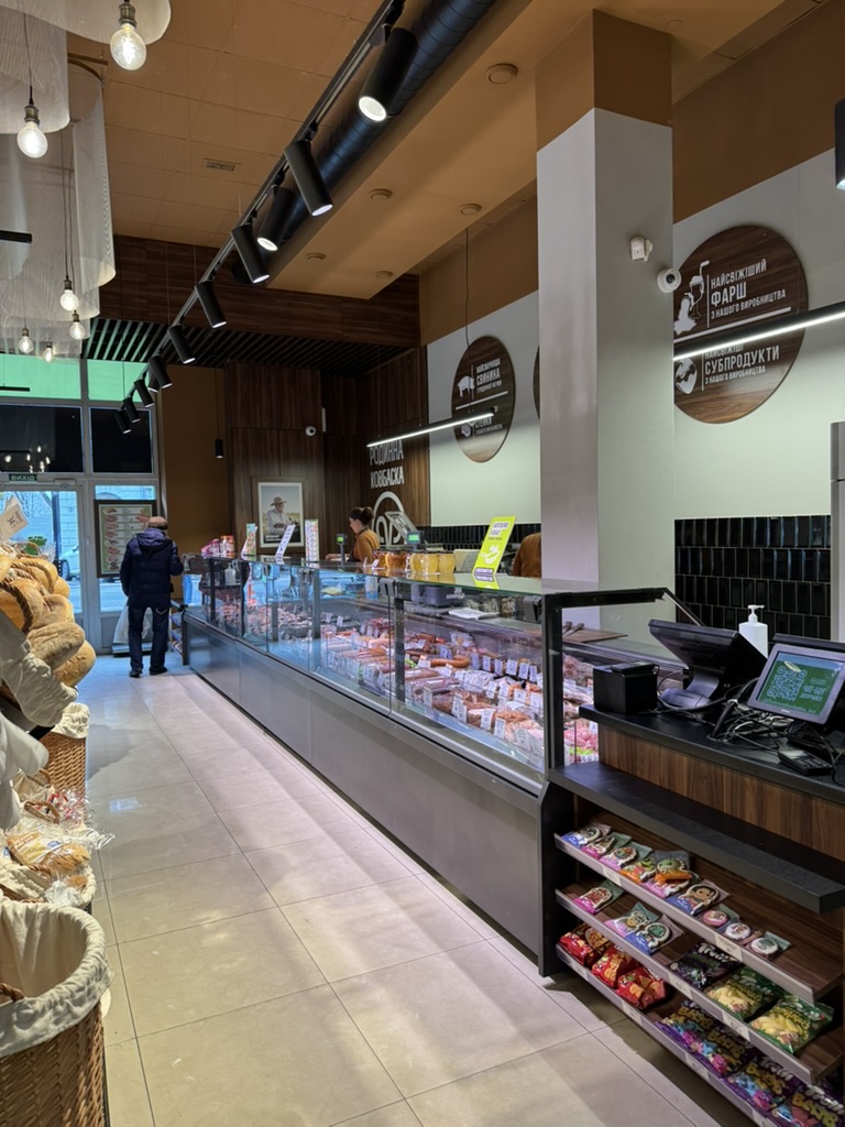 Класика, з якої все почалося. Ті самі знайомі магазини у житлових районах — це основа мережі. Невеликі, на 50–80 квадратів, з акцентом на ковбаси, свіже м’ясо, хліб і простий, швидкий сервіс. Саме з таких магазинів починалась «Родинна ковбаска», і саме вони допомогли компанії масштабуватися по західному регіону. Але з часом стало зрозуміло: покупці чекають не тільки на якість продукту, а й на емоцію — атмосферу, зручність, стиль.