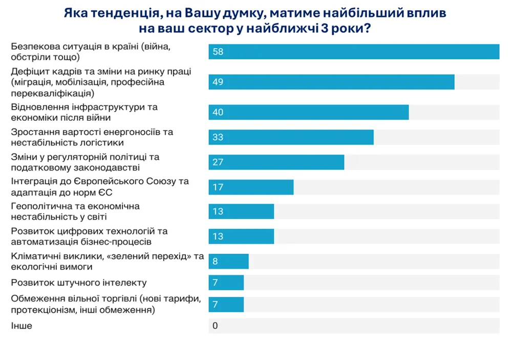 Безпекова ситуація залишається головним бар’єром для розвитку бізнесу. Ризики, пов’язані з війною, ракетними ударами та загрозами фізичній інфраструктурі, як першочергову проблему вказали 58% респондентів.