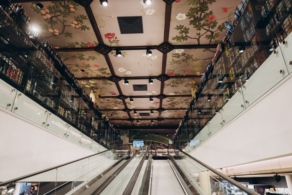 Острів «Кулінарії» відтворює атмосферу старого іподрому на Печерських пагорбах, а касові лайтбокси виконані у вигляді вітражів, як у будинку Ікскюль-Гільденбанда.