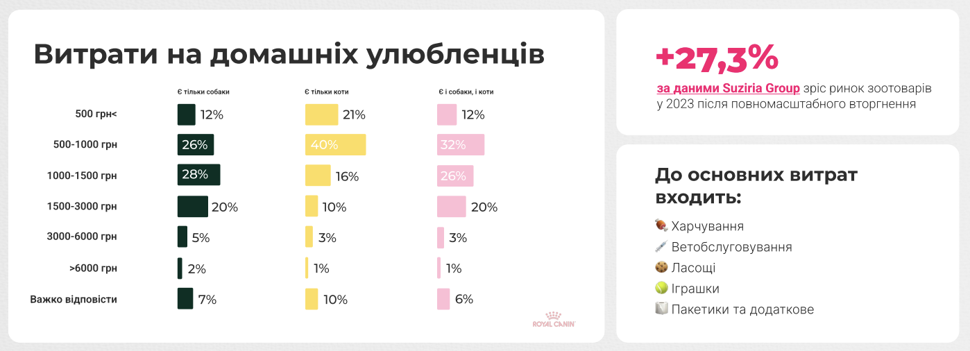 Понад 50% власників витрачають щомісяця від 500 до 1500 грн на догляд за своїми улюбленцями. Основні витрати йдуть на харчування: за оцінками, у 2025 році виторг у сегменті корму для тварин в Україні становитиме ≈ $564,6 млн. На другому місці, проте не менш пріоритетні витрати йдуть на ветеринарні послуги, щеплення, смаколики та іграшки.