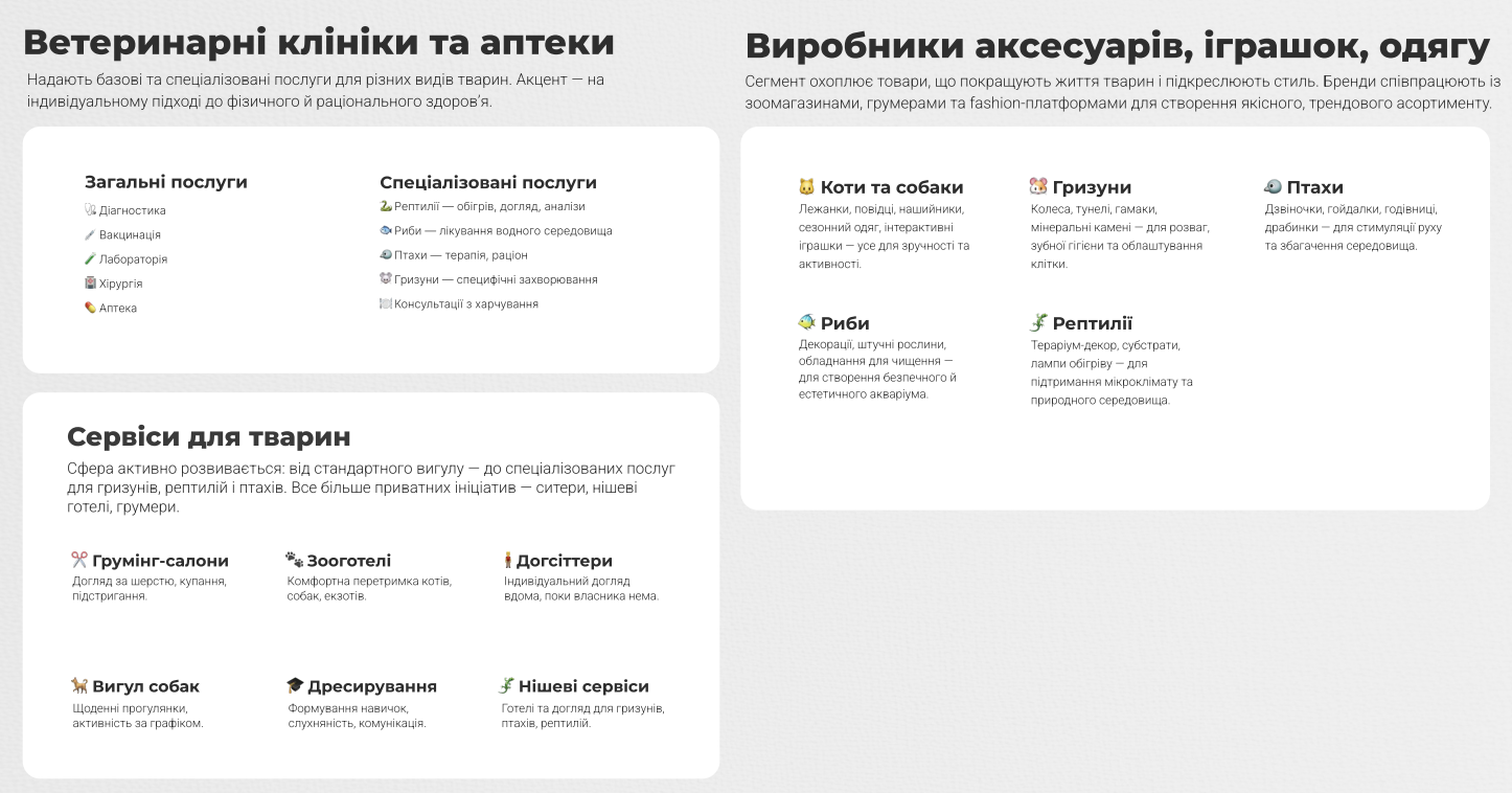 Український ринок товарів і послуг для домашніх тварин охоплює п’ять основних напрямів. Найбільший сегмент — виробники та дистриб’ютори кормів і ласощів, далі зоомагазини, потім ветеринарні клініки та аптеки, і наостанок — виробники аксесуарів, іграшок та одягу.