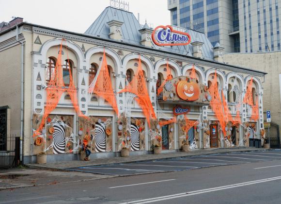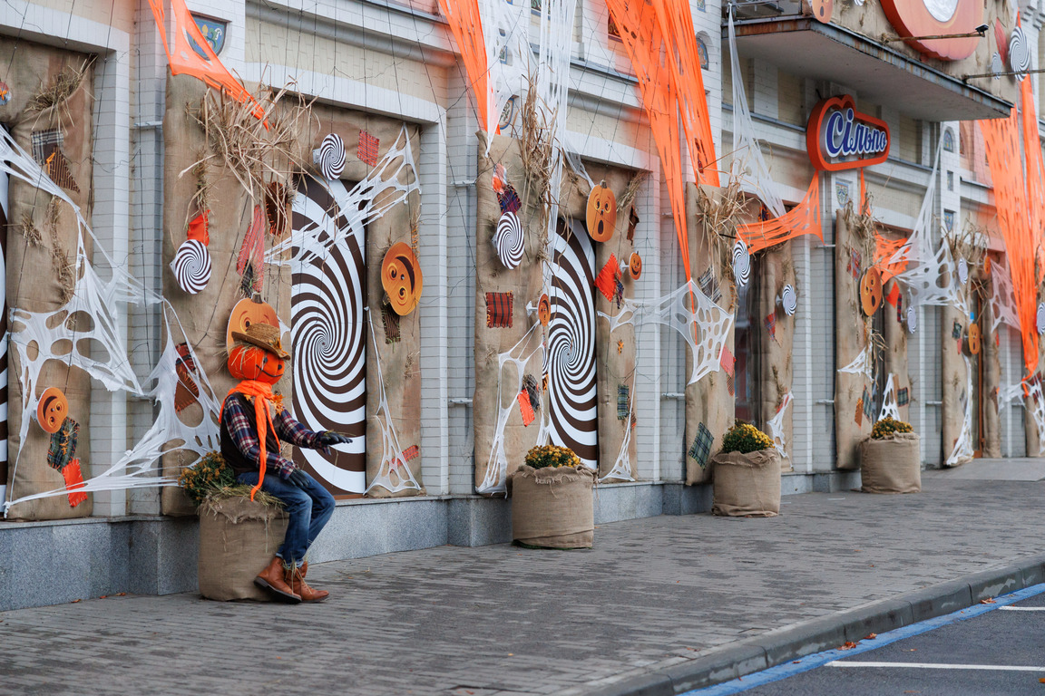 У Дніпрі Гостей «Сільпо» зустрічають декоративні опудала, усміхнені гарбузики та павучки, які обплели павутиною фасад магазину. Вони створюють химерний сюжет у стилі мультфільмів Тіма Бертона і передають настрій Геловіну.