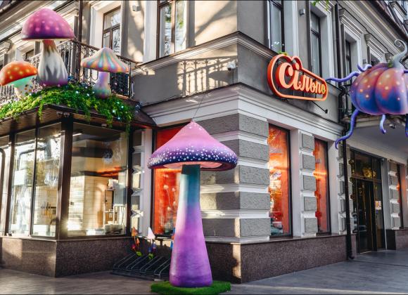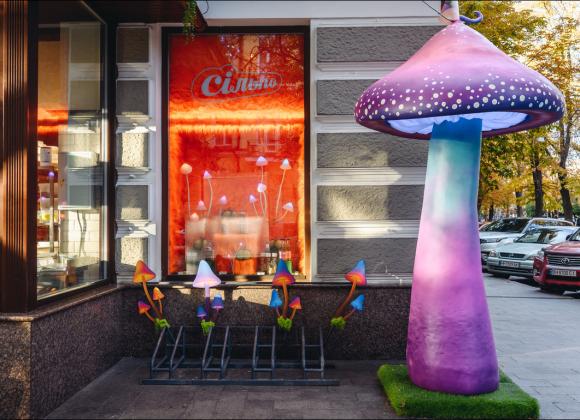 В Одесі вхід до магазину прикрасили гігантськими світловими грибами в яскравих неонових кольорах, які відразу привертають увагу. Гості ніби потраплять до фентезійного лісу, де серед моху, скляних банок, гарбузів і дивовижних деталей магічні істоти облаштували алхімічну лабораторію.