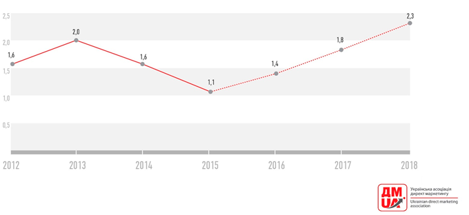 По оценке УАДМ, общий объем рынка e-commerce по итогам 2014 года составил $1,6 млрд (только B2C-продажи) при расчете по среднегодовому курсу НБУ 11,87 грн за $1.