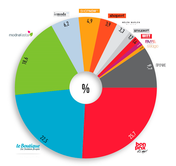 В список лидеров сегмента по итогам 2014 года вошли интернет-магазины, которые не были представлены в рейтинге за 2013 год, а именно Lamoda и Stilago (в 2015 году Stilago прекратил работу в Украине). Показатели по Shopnow и Shopart в этом году представлены отдельно.
