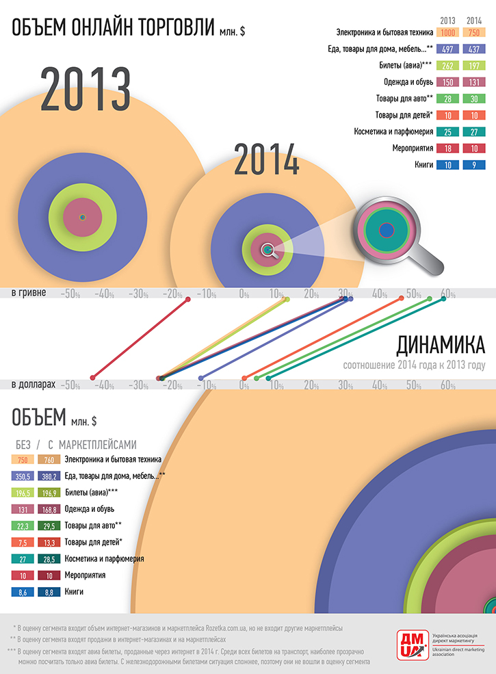 Украина всегда была страной «потенциала и возможностей». В том смысле что потенциал есть, но он, по большей части, никак не реализовывался. У нас есть запас для роста практически во всех сегментах. Больше возможностей роста в сегментах, которые находятся на старте развития, таких как стройматериалы, спорт и детские товары. Сложнее расти в высоко конкурентных сегментах — электроника, авиабилеты. При этом сложная политико-экономическая ситуация в стране на различных сегментах сказывается по-разному — какие-то сегменты падают в гривне, а какие-то даже растут в долларе. Почитайте исследование, там много интересного.