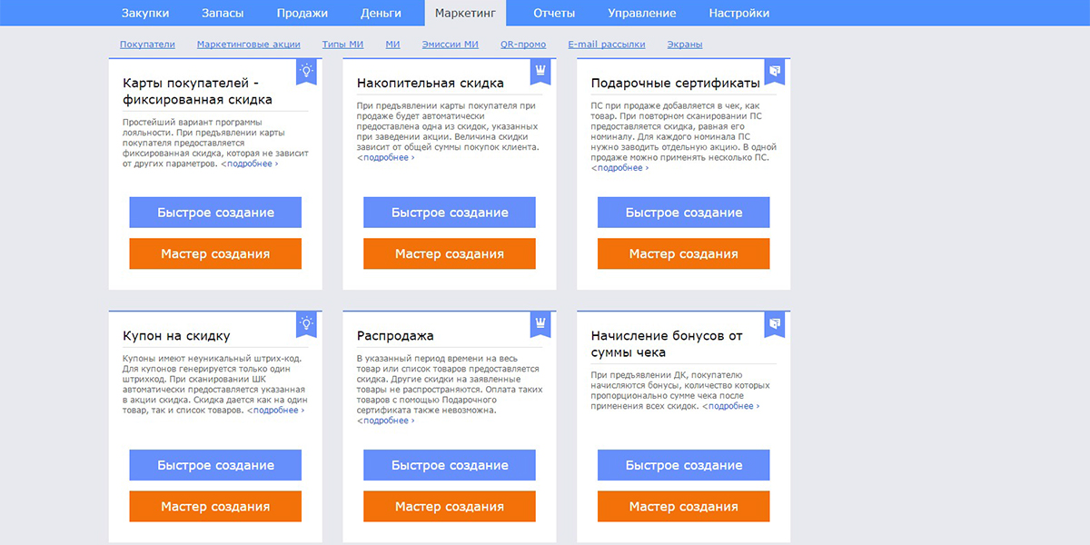 Workabox помогает упростить работу пользователя с маркетинговыми инструментами. Создание бонусных программ лояльности, распродаж, купонов на скидку, подарочных сертификатов производится в кабинете пользователя и занимает считаные минуты. Карты покупателя можно изготовить из пластика и вручить постоянным покупателям, либо же распространять виртуальные бонусные карты через специальное мобильное приложение.