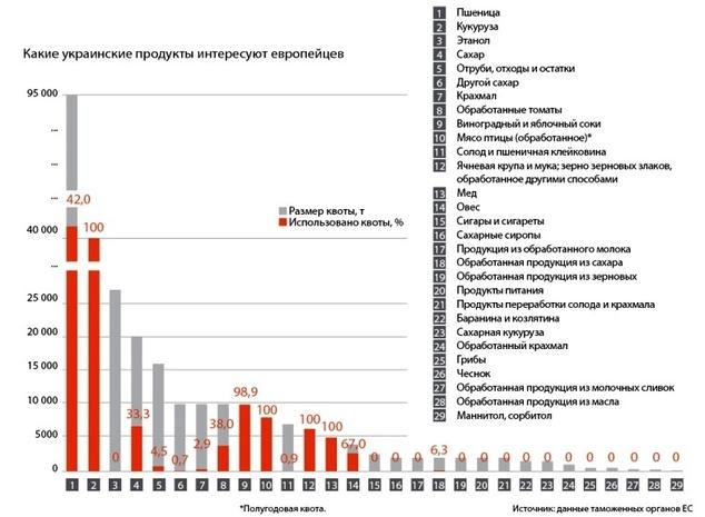 Некоторые «квотные» позиции нашим производителям попросту неинтересны. К примеру, кондитеры добились нулевой пошлины на ввоз своей продукции в ЕС, заявляет президент ассоциации «Укркондпром» Александр Балдынюк, равно как и молочники. Но если украинских сладостей в Европу в прошлом году продали около 10 800 т, то молочной продукции — около нуля. ЕС до сих пор не признал продукцию украинских молочников соответствующей европейским стандартам безопасности и качества. В сентябре-октябре 2014‑го Офис ветеринарной медицины и пищевых продуктов при Еврокомиссии проверил пять украинских производителей молочных продуктов. В опубликованном отчете сказано, что у трех из них есть перспективы выхода на рынок ЕС.