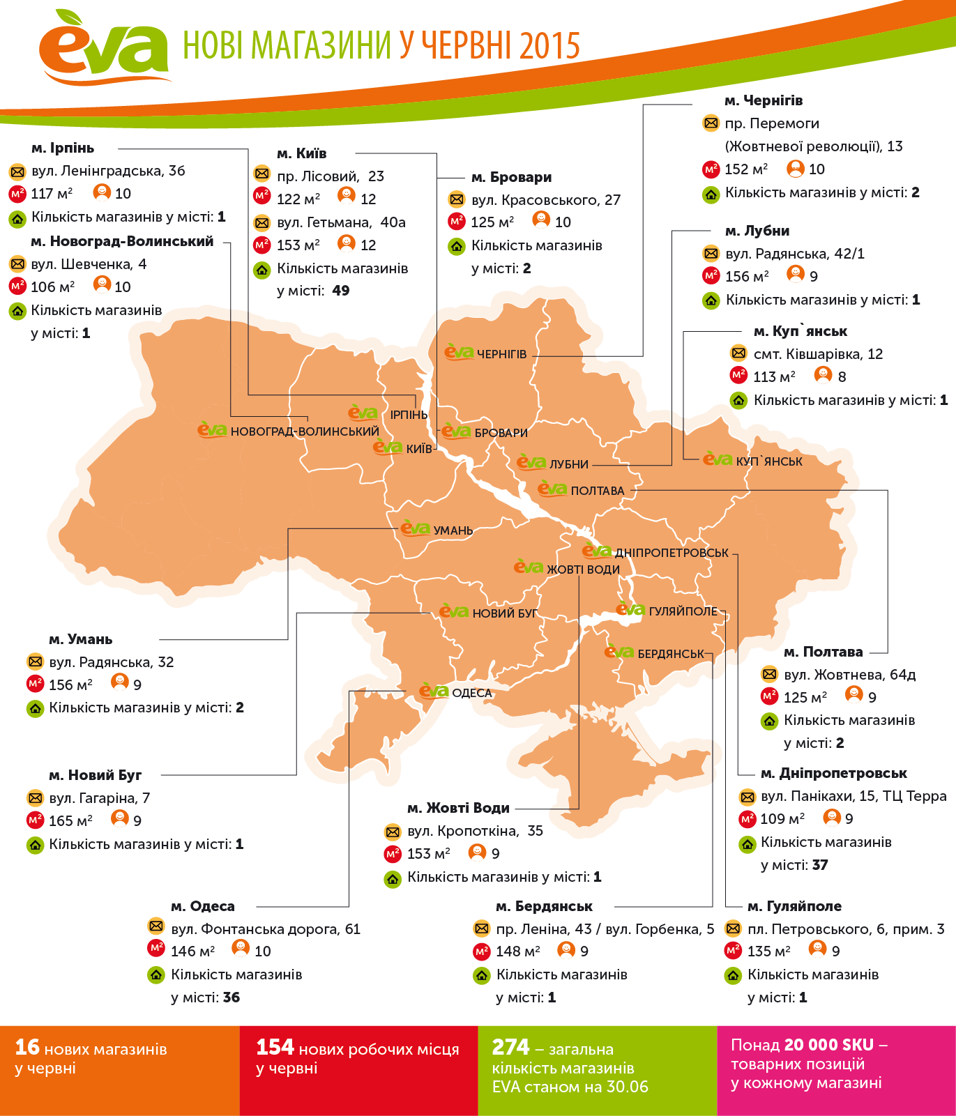 Национальная сеть «Линия магазинов EVA» открыла в июне 16 новых магазинов в 10 областях Украины. Было создано 154 новых рабочих места. По состоянию на 30 июня 2015 года общее количество магазинов EVA в Украине составляет 274.